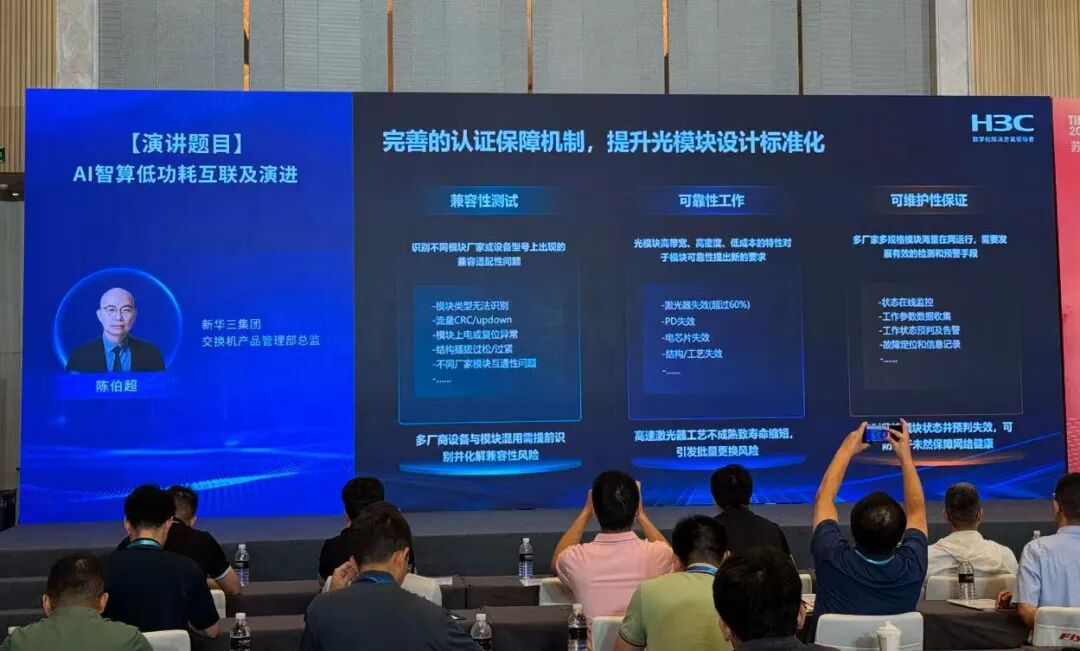 在本次大会上,新华三交换机产品的陈伯超总监在主题演讲中专门强调了光模块与交换机兼容性问题,他们发现有大量识别不同模块厂家或设备型号上兼容适配性问题,如模块类型无法识别,模块上电或复位异常等等。海回科技的 CMIS 协议兼容性测试为可插拔模块的标准化奠定坚实基础,实现多供应商的互操作性,降低产业内的沟通和协作成本,为可插拔模块标准化树立行业标杆,推动光通信网络持续演进、融合与发展。