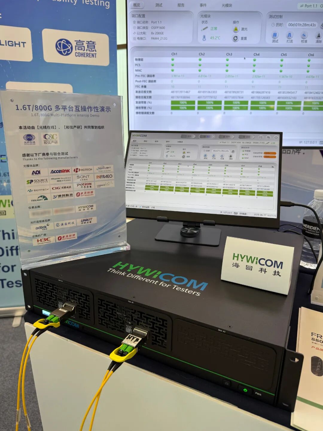 在本次大会上,海回科技在其业界领先的多端口 1.6T (224G SerDes) 高速以太网测试平台 — FRAEO 16T2 上成功地进行了包括全球光模块头部厂商苏州旭创、Coherent 高意在内的 1.6T 光模块的互联互通测试。这是业界首次展示多厂商、多方案的 1.6T 光模块在真实的 8x200GE 以太网流量下的对通测试,实测通道误码率及性能超过 AI 应用的严苛标准,长期测试下 FEC 余量充足且稳定,为 1.6T 光互联的大规模商用提供强有力的支撑。