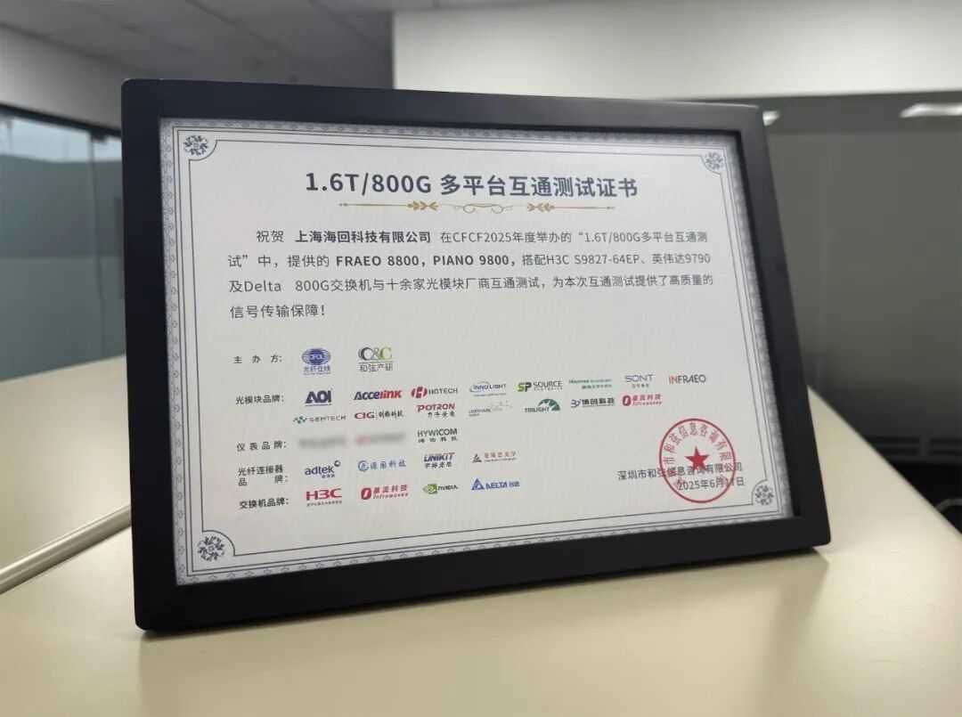 近日,光通信行业年度盛会 CFCF2025 光连接大会 在苏州盛大召开。海回科技受大会邀请主导了业界首次 1.6T 光模块多厂商互联互通测试,CMIS 管理接口兼容性和互通测试,并且搭配新华三 H3CS9827-64EP、英伟达 9790 及 Delta 800G 交换机与十余家光模块厂商进行 800G 光模块互通测试,成为本次大会的瞩目焦点。