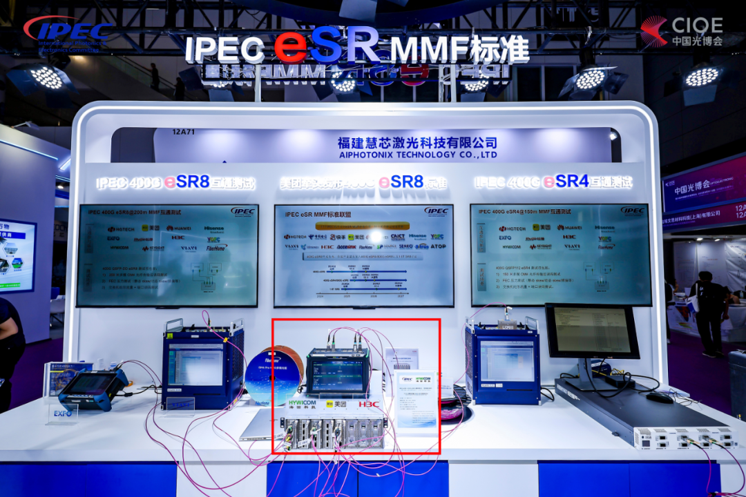 海回科技在本次 CIOE 活动现场,携手 IPEC 国际光电委员会以及近二十家厂商进行 1.6T/800G 光模块测试现场联合展示。